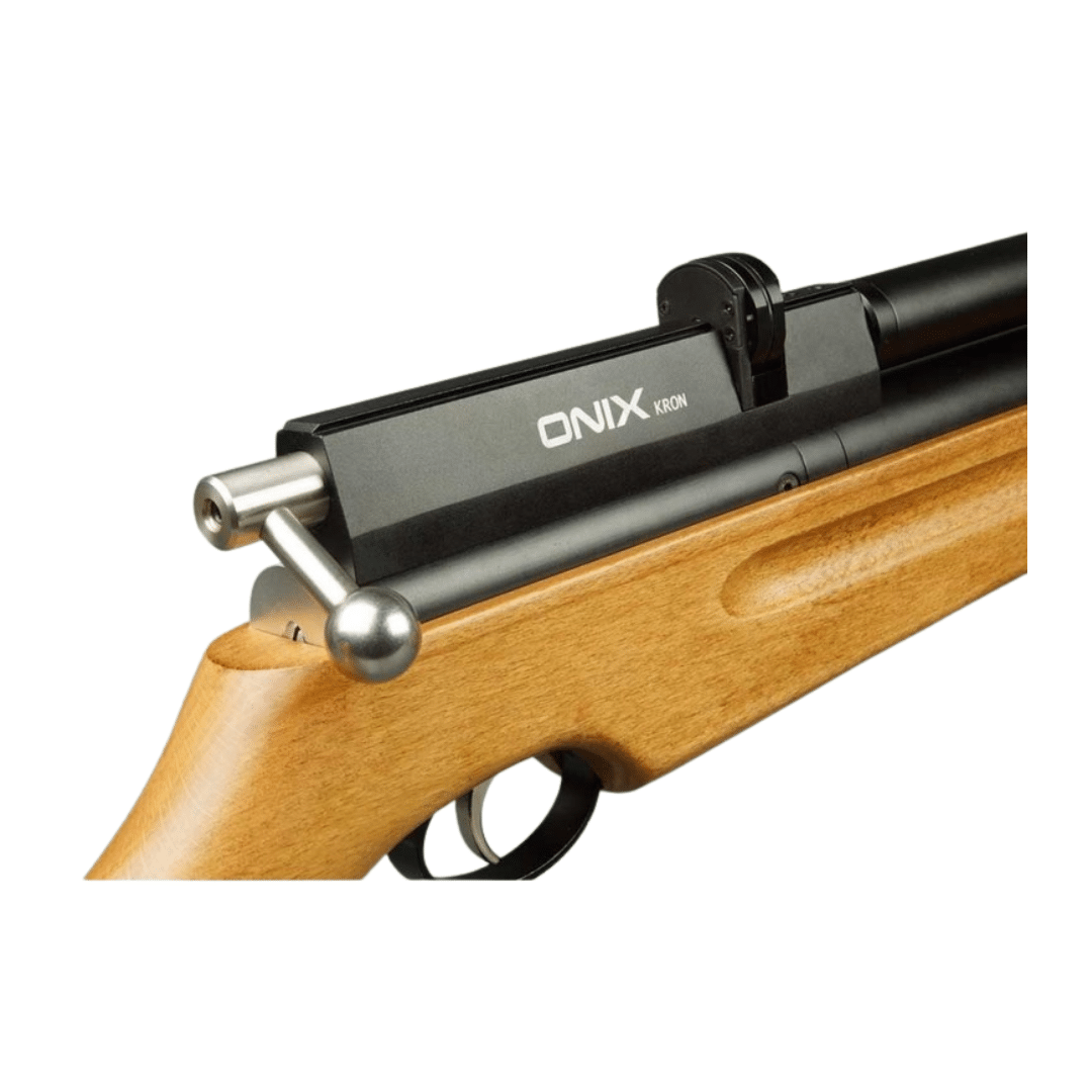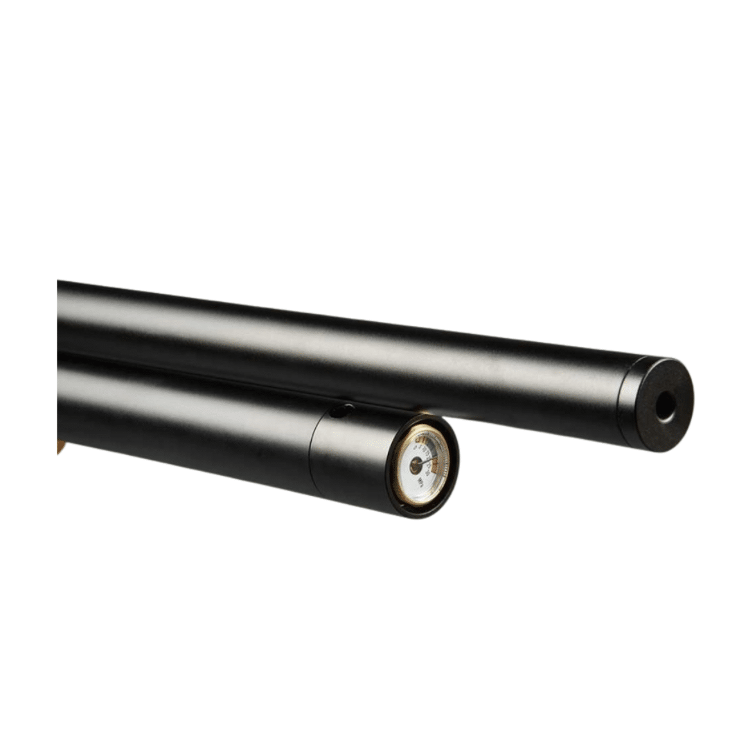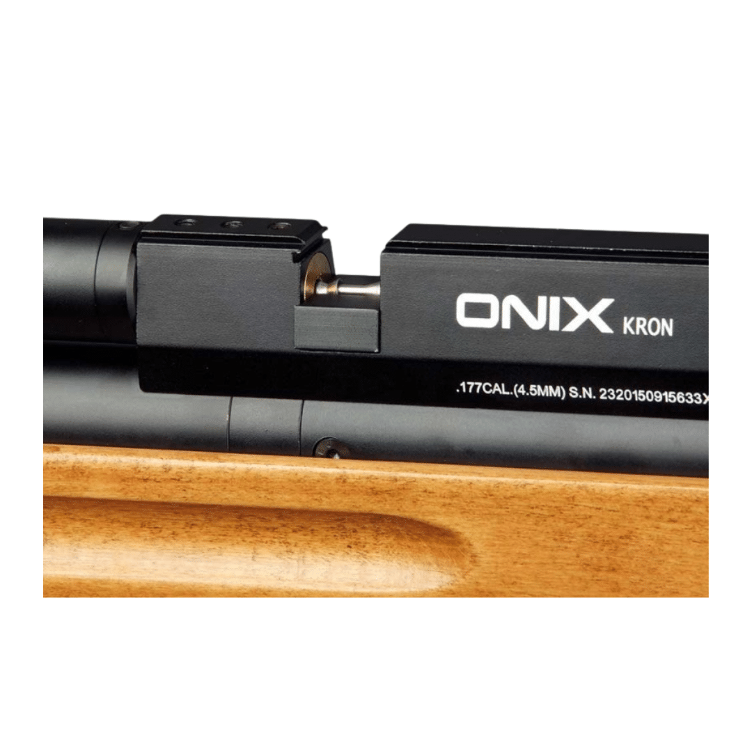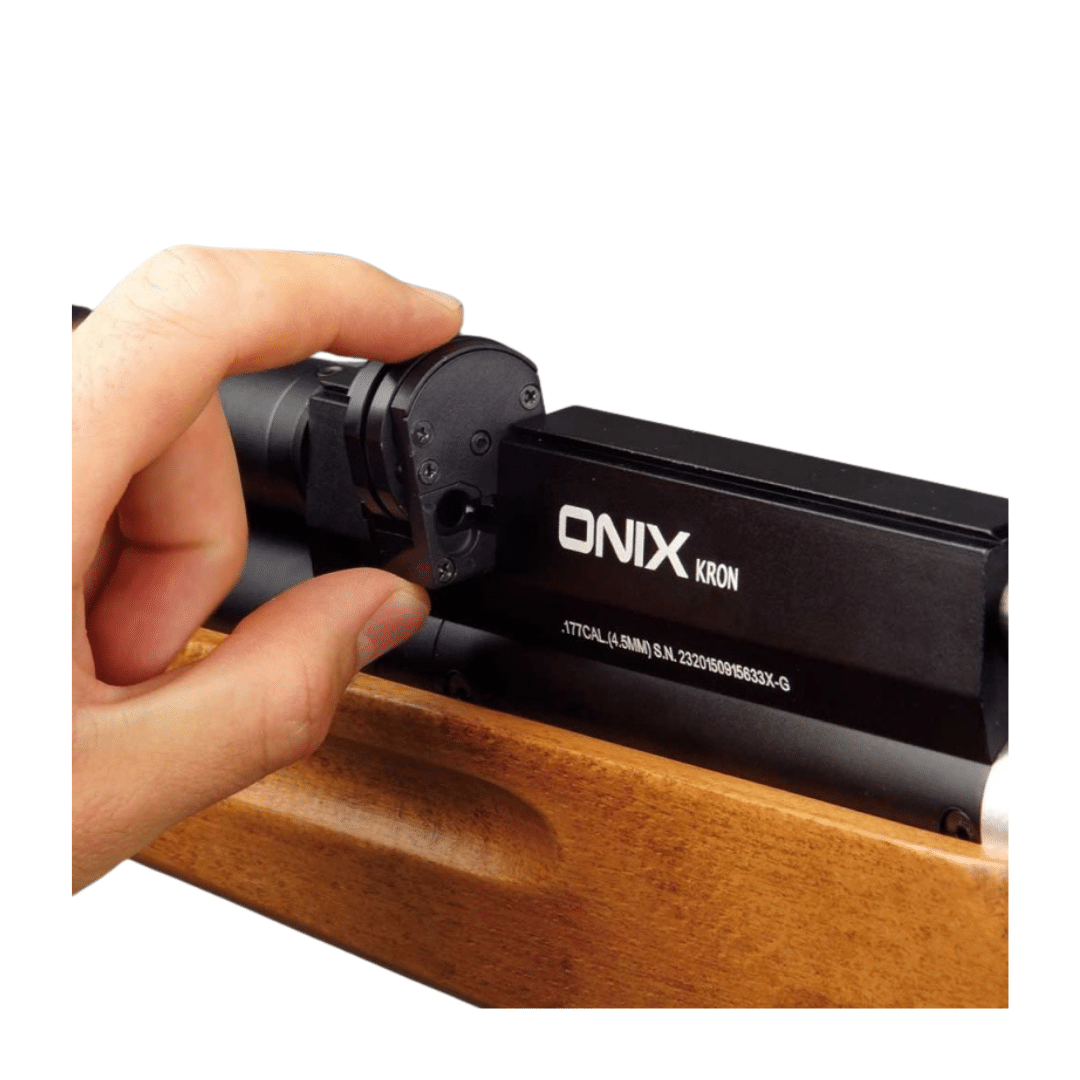 Carabina de aire comprimido PCP Arcea Onix Kron. Diseñada para quienes buscan precisión, estabilidad y una construcción robusta en cada disparo. Su depósito de 250 cc, con una presión máxima de 200 bares, incorpora un manómetro frontal que permite comprobar la presión de forma rápida y cómoda. Además, equipa una válvula reguladora con su propio manómetro, lo que garantiza una entrega de aire constante y agrupaciones muy precisas incluso a 50 metros.
