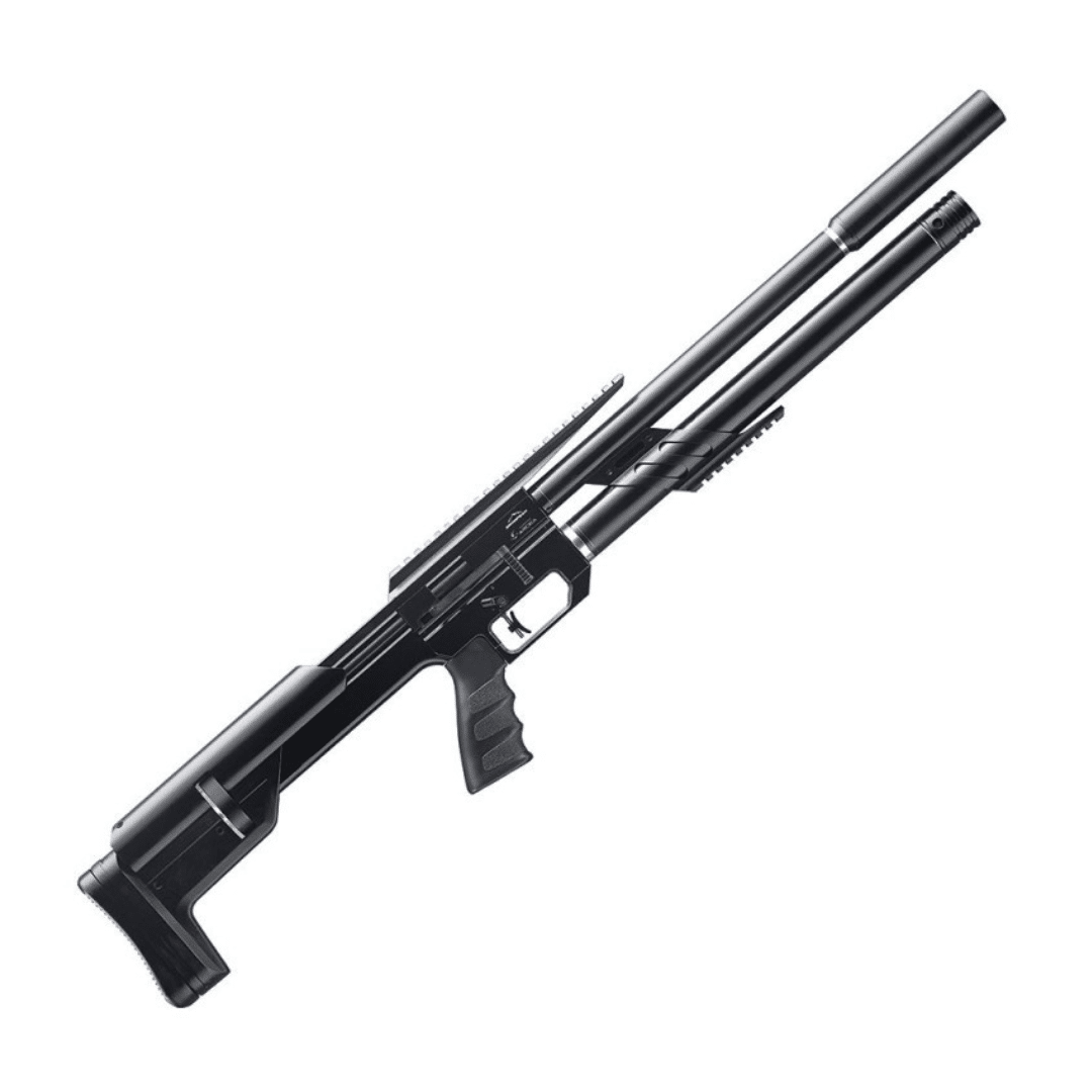La carga se realiza mediante sonda con conector rápido Foster, un sistema seguro y práctico. Su cerrojo de palanca lateral adelantado facilita un manejo ágil y fluido, mientras que el gatillo de dos tiempos regulable en altura, con seguro incorporado, proporciona un disparo suave, progresivo y muy controlado. Con una potencia inferior a 24 julios, ofrece alrededor de 60 disparos óptimos por carga.