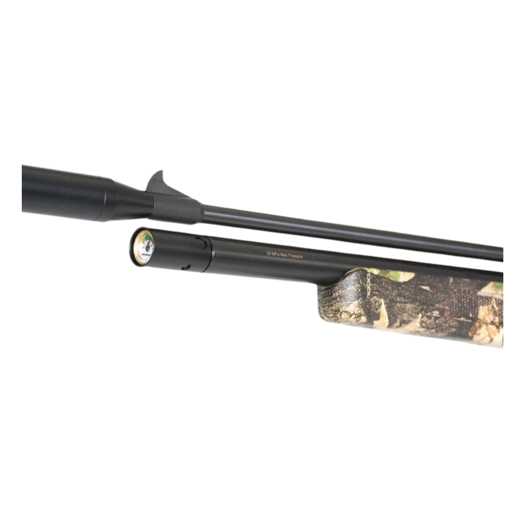 Carabina de aire comprimido PCP Arcea Snowpeak PR900 CAMO. Este modelo destaca por su equilibrio entre potencia, precisión y facilidad de uso. Incorpora un depósito de 100 cc fabricado en acero, con presión máxima de carga de 200 bares, manómetro integrado en el extremo y válvula reguladora, garantizando un rendimiento estable tiro tras tiro. La sonda de carga con conector rápido tipo Foster facilita un llenado seguro y eficiente. El gatillo de dos tiempos, acompañado de seguro, permite un disparo suave y controlado. Incluye adaptador monotiro y cargador multitiro. El silenciador desmontable reduce notablemente el ruido, y el arma incorpora mira y alza para tiro sin visor, además de un carril de 11 mm para instalar ópticas. Por otro lado, sus dimensiones y su peso la convierten en un arma cómoda y manejable.