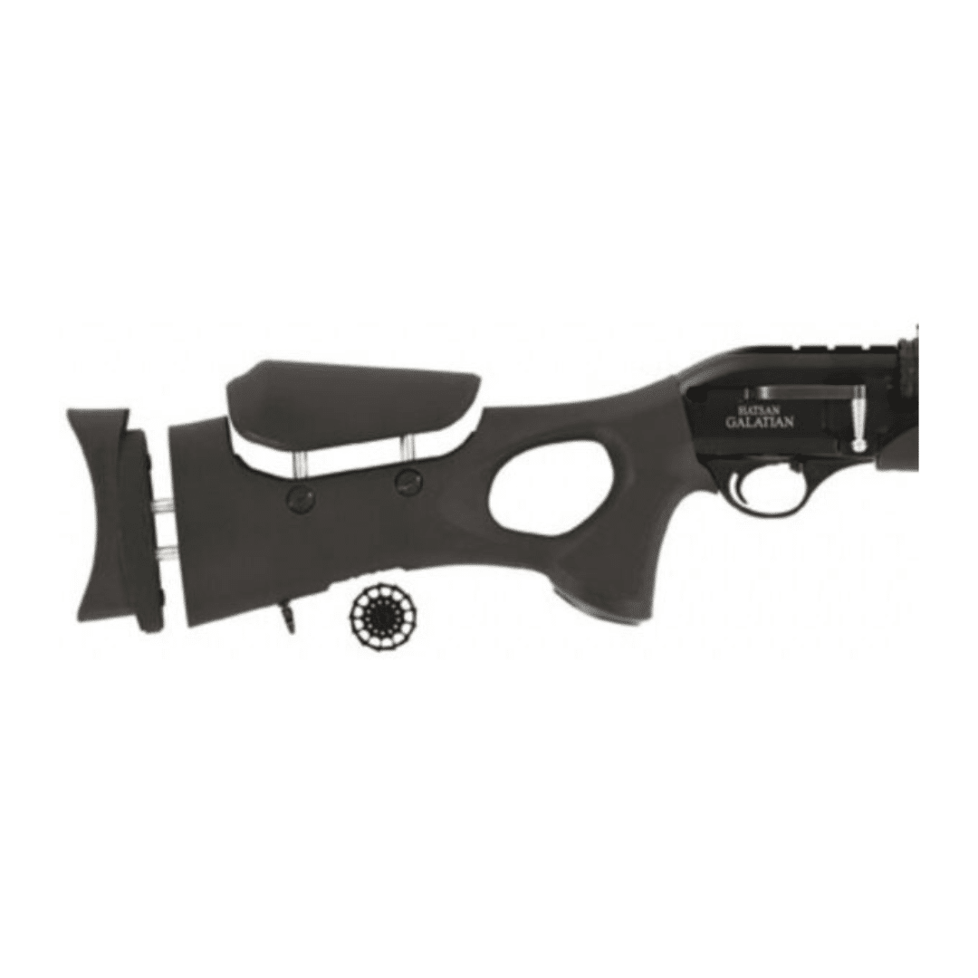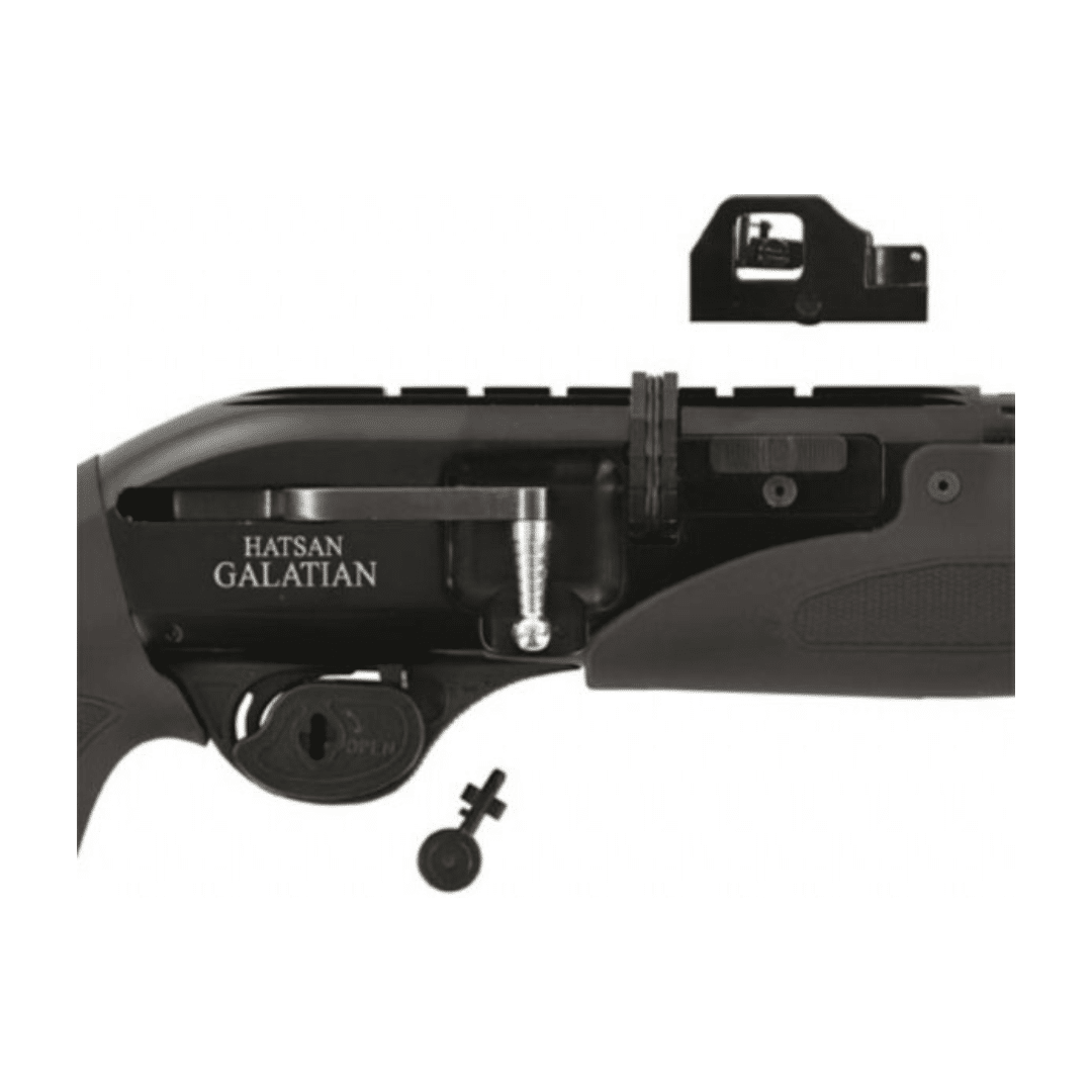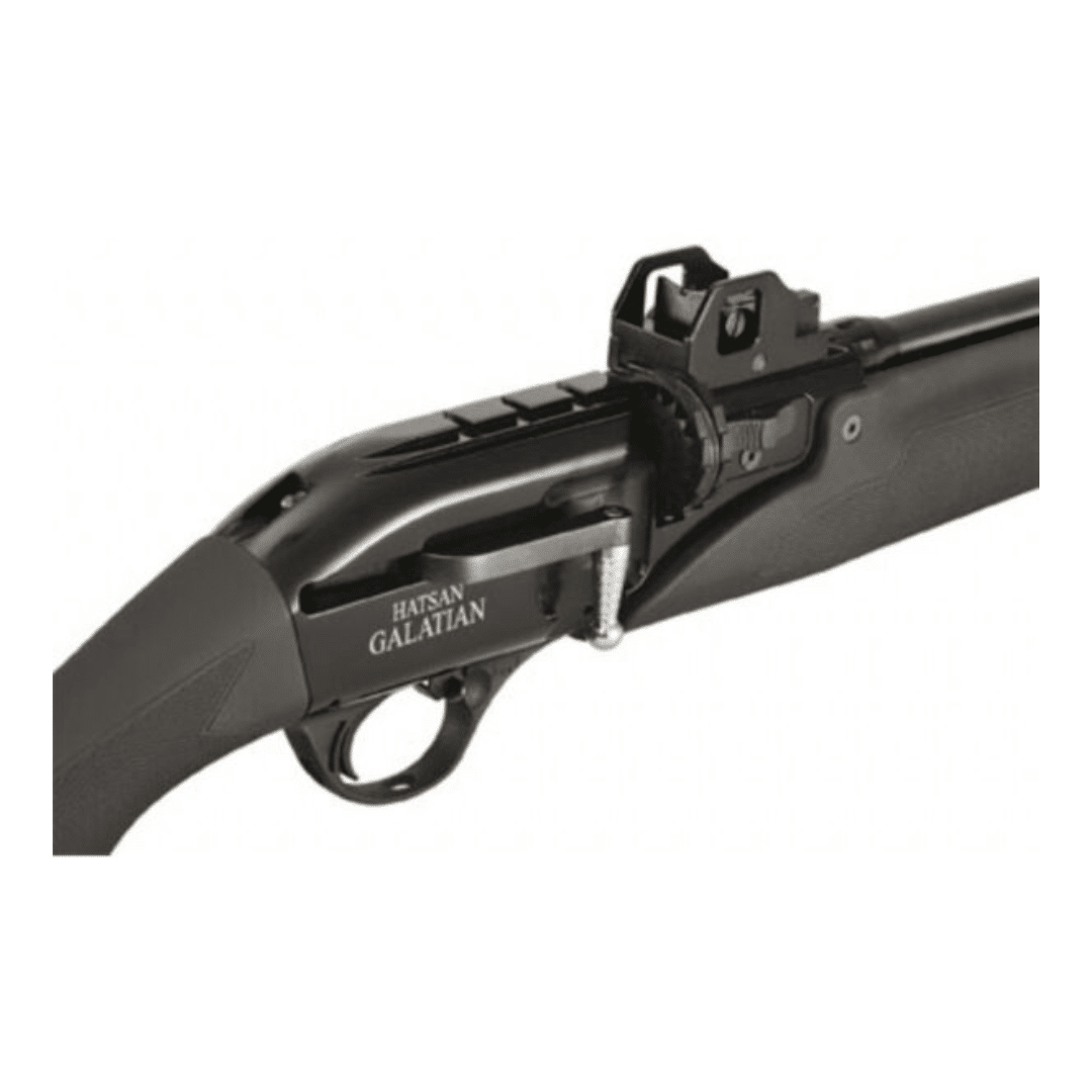 Carabina PCP Hatsan GALATIAN III, de alto rendimiento que combina potencia, versatilidad y un diseño táctico moderno. Su sistema de carga manual mediante cerrojo lateral ofrece un manejo fluido, mientras que su cargador rotatorio de 16 tiros en calibre 4,5 mm (14 en 5,5 mm), con 2 cargadores incluidos, permite largas sesiones de tiro sin interrupciones. El mecanismo preventivo evita la doble alimentación, garantizando seguridad y fiabilidad.