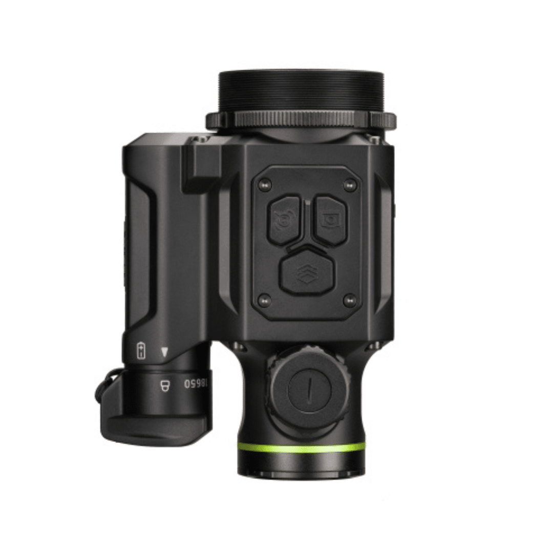- Manejo fácil e intuitivo. El dispositivo térmico acoplable se puede manejar de forma silenciosa e intuitiva gracias al diseño de 3 botones y a la rueda de enfoque ergonómica y suave. La navegación por el menú se puede realizar cómodamente mediante el mando a distancia Bluetooth incluido, que cuenta con una base magnética para fijarlo al arma.