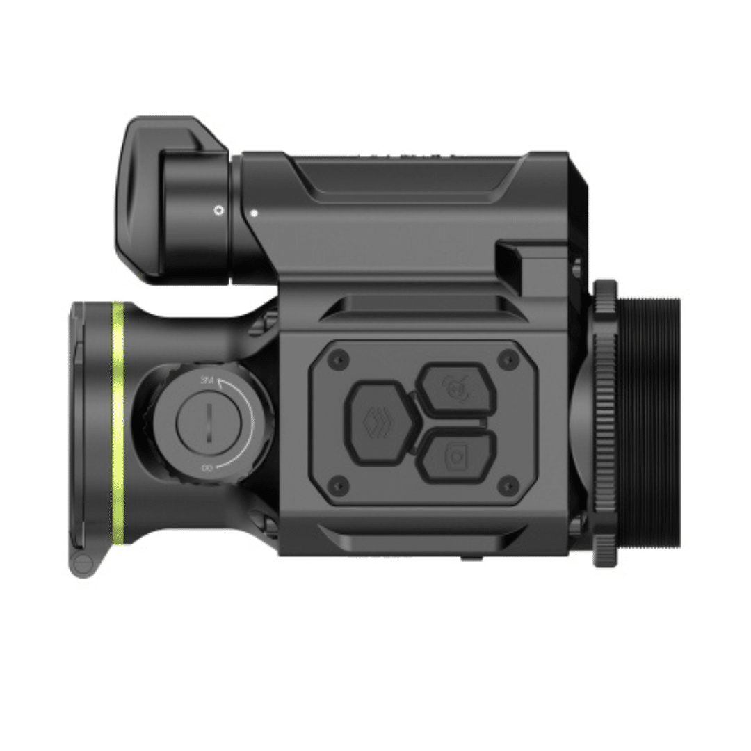 - Manejo fácil e intuitivo. El dispositivo térmico acoplable se puede manejar de forma silenciosa e intuitiva gracias al diseño de 3 botones y a la rueda de enfoque ergonómica y suave. La navegación por el menú se puede realizar cómodamente mediante el mando a distancia Bluetooth incluido, que cuenta con una base magnética para fijarlo al arma.