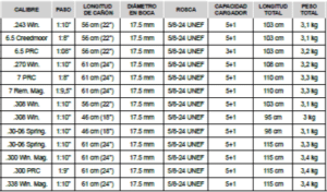 Cañón Bergara. Es siempre uno de los grandes exponentes de la marca por su garantía de calidad y precisión. En este modelo encontramos tres opciones de cañón, 46 cm, 56 cm o 61 cm, todod con un diametro de boca de 17.5 mm. Fabricado en acero 4140 CrMo con un acabado Graphite Black Cerakote™ (protegiéndolo de elementos dañinos, tanto químicos como atmosféricos). Todos los cañones Bergara vienen con rosca en el extremo del cañón. - Incluye alzas y miras sin montar. Excepto el calibre 338 Win. Mag,