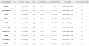 • Cañón Bergara. Es siempre uno de los grandes exponentes de la marca por su garantía de calidad y precisión. Este modelo cuenta con un cañón flotante de acero CrMo 4140 con un estriado profundo y un freno de boca omnidireccional, acabado en Sniper Grey Cerakote, con 17,7 mm de boca y en longitudes de 51 cm, 56 cm y 61 cm.