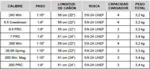 - Cargador extraíble Cascade: capacidad de 4 balas en calibres 243 Win, 6.5 Creedmoor y 308 Win. Y 3 balas en calibres 6.5 PRC, 7 PRC, 300 PRC, 30-06 Spring y 300 Win Mag.