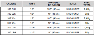 - Calibres: 300 BLK, 350 LEG y 308 Win.