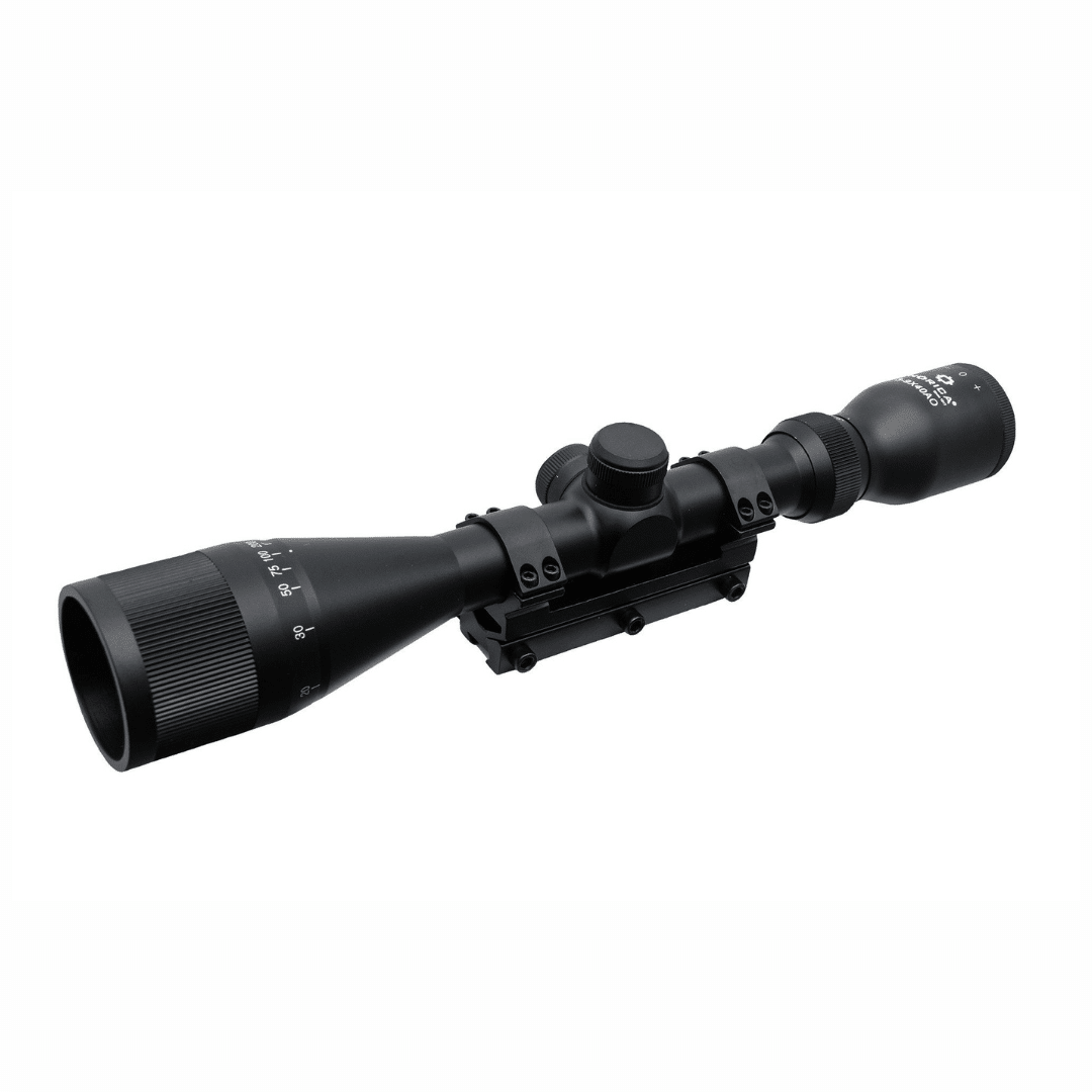 Visor Norica 3-9×40 AO MAGNUM. Visor especialmente diseñado para carabinas GRS. Está internamente reforzado para resistir el impacto del GRS, con montura carril para un mejor amarre. Con retículo 4 Plex y enfoque y paralaje ajustables. Incluye montaje de una pieza de 3/8″ con perno tope de retroceso.