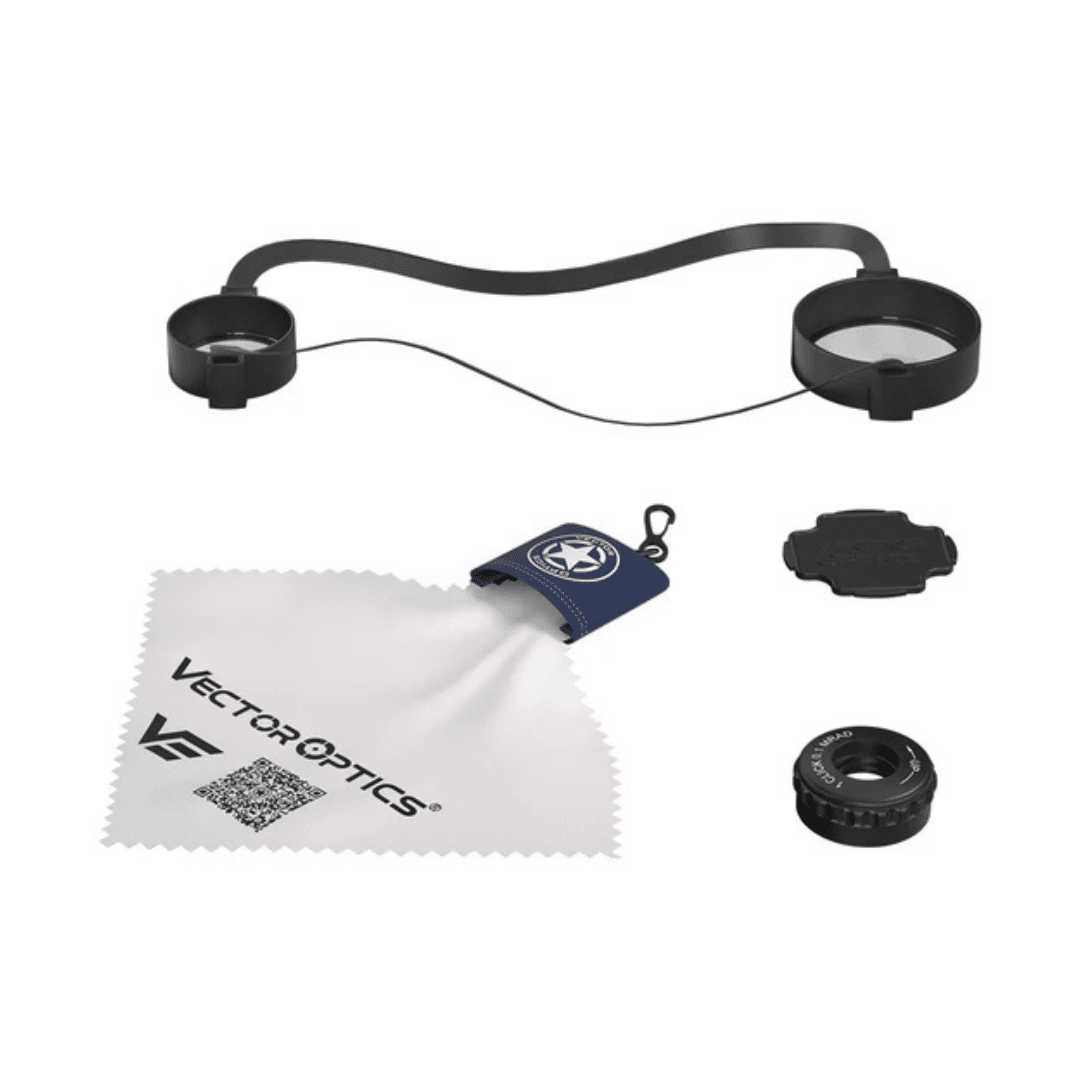 Contenido de la caja: visor, llave de plástico, tapas protectoras para lentes, paño de limpieza, manual de usuario, torreta de elevación de repuesto.